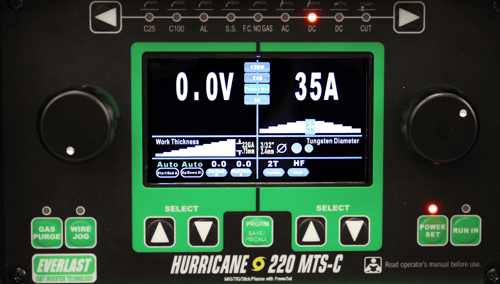 There is no true multi-process welder like the Hurricane 220 MTS-C. In fact, it’s among the first on the market to combine cutting and welding capabilities into a single small device. With just a torch change and button press, the equipment truly gives you the ability to MIG weld, AC/DC TIG weld, DC Stick Weld, or Plasma Cut. The device is the ideal size to be a competitive option for light fabrication and portable repair tasks.