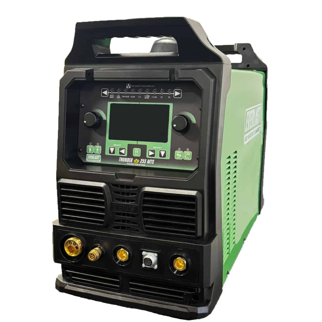 Everlast’s PowerMTS 211SI has more than enough capability to handle most daily chores. The panel and programming has been designed so that the operator has command of all the features without having to access complicated menus or open the cover. The foot pedal and TIG torch are included and connect directly to the front. There are no special adaptations or equipment required to weld TIG. The TIG torch does not need a manual gas valve because gas flow is controlled automatically and is programmable on the panel for both pre-flow and post-flow operation. The PowerMTS 275Lightning boasts a 60% duty cycle (240V) at 250 amps for MIG/TIG (AC/DC!) and 200 amp stick. With this unit you can save up to 9 programs as favourites. The PowerMTS 275 Lightning includes a 36 Series Euro fast connect MIG gun and is dual voltage. Our PowerMTS 251SI includes a 25 series Euro fast connect MIG gun and offers Pulse MIG, Syn MIG and Pulse TIG function. Additionally, the PowerMTS 251Si offers one more distinctive feature: it allows to the operator to choose from a touchless, high frequency start or a lift start in TIG mode. The stick mode offers more adjustability than ever with the addition of hot start intensity and hot start duration controls. Everlast’s PowerMTS 225Lightning offers MIG, AC/DC TIG with high frequency start and stick capability and has been completely redesigned. As with the 251SI, stick mode operation has been improved with the addition of Hot Start duration and Hot start intensity adjustments. Combined with the arc force control this makes the 160 amp Stick mode very capable of handling up to 1/8″ welding rods.