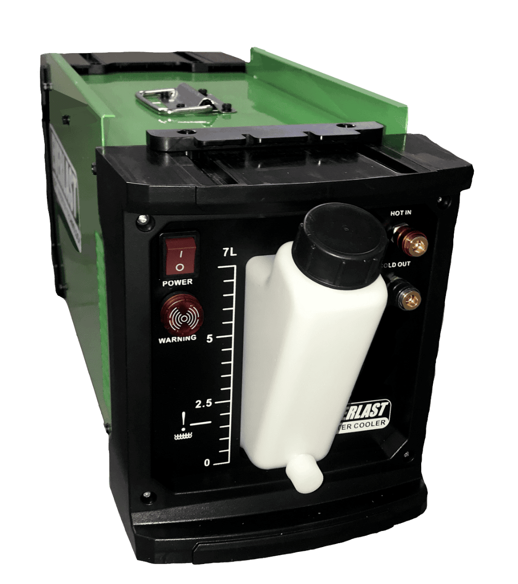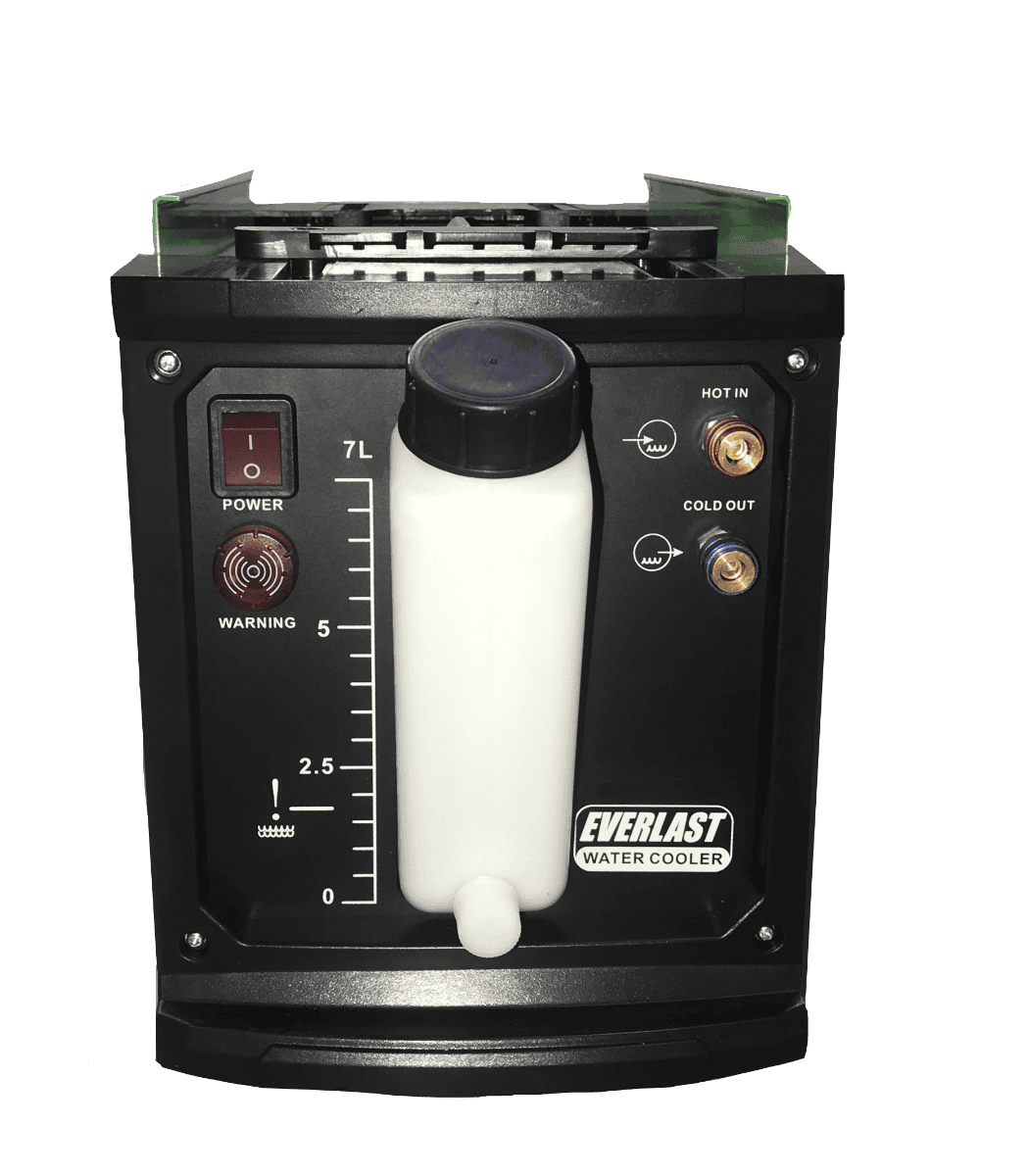 The Power Cool W375 240V water cooler from Everlast is designed to work with Everlast TIG welders to provide maximum cooling capacity. The unit includes a special 220V/240V plug for the socket on the Everlast welder rear panel. This plug may be removed or changed for applications with other brands of welders. The unit features color coded quick connectors for rapid and correct connection of the torch lines. The radiator is made from copper for maximum cooling capability and the Italian made pump is made from stainless steel with a bronze impeller for durability. The Italian industrial motor is sealed for maximum protection from the elements. A generous reservoir holds just a little over 2 gallons of coolant for efficient circulation capacity. Use a rated TIG Coolant. Do not use automotive anti freeze. **Not compatible with PowerTIG 185DV**